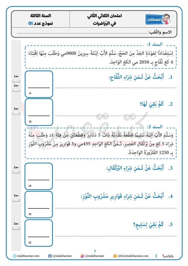 امتحانات رياضيات مع الإصلاح السنة الثالثة 3️⃣ الثلاثي الثاني