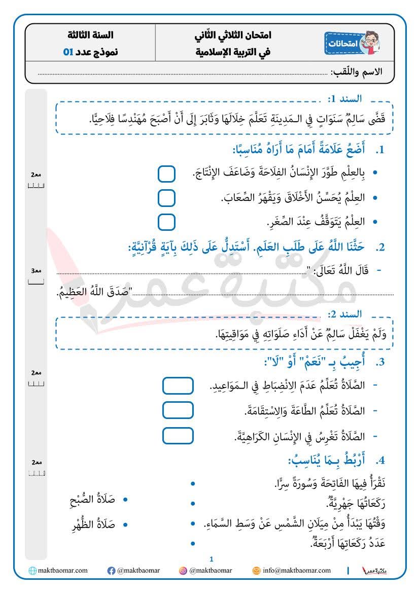 امتحانات التربية الاسلامية مع الإصلاح السنة الثالثة 3️⃣ الثلاثي الثانيبواسطة Admin / 24 فبراير، 2026 امتحانات التربية الاسلامية مع الإصلاح السنة الثالثة 3️⃣ الثلاثي الثاني