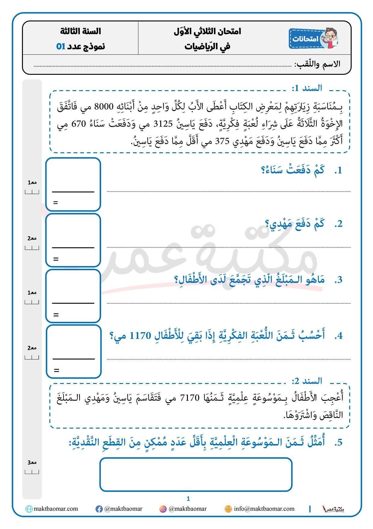 امتحانات رياضيات السنة الثالثة 3️⃣ الثلاثي الأولبواسطة Admin / 28 أكتوبر، 2025 امتحانات رياضيات السنة الثالثة 3️⃣ الثلاثي الأول