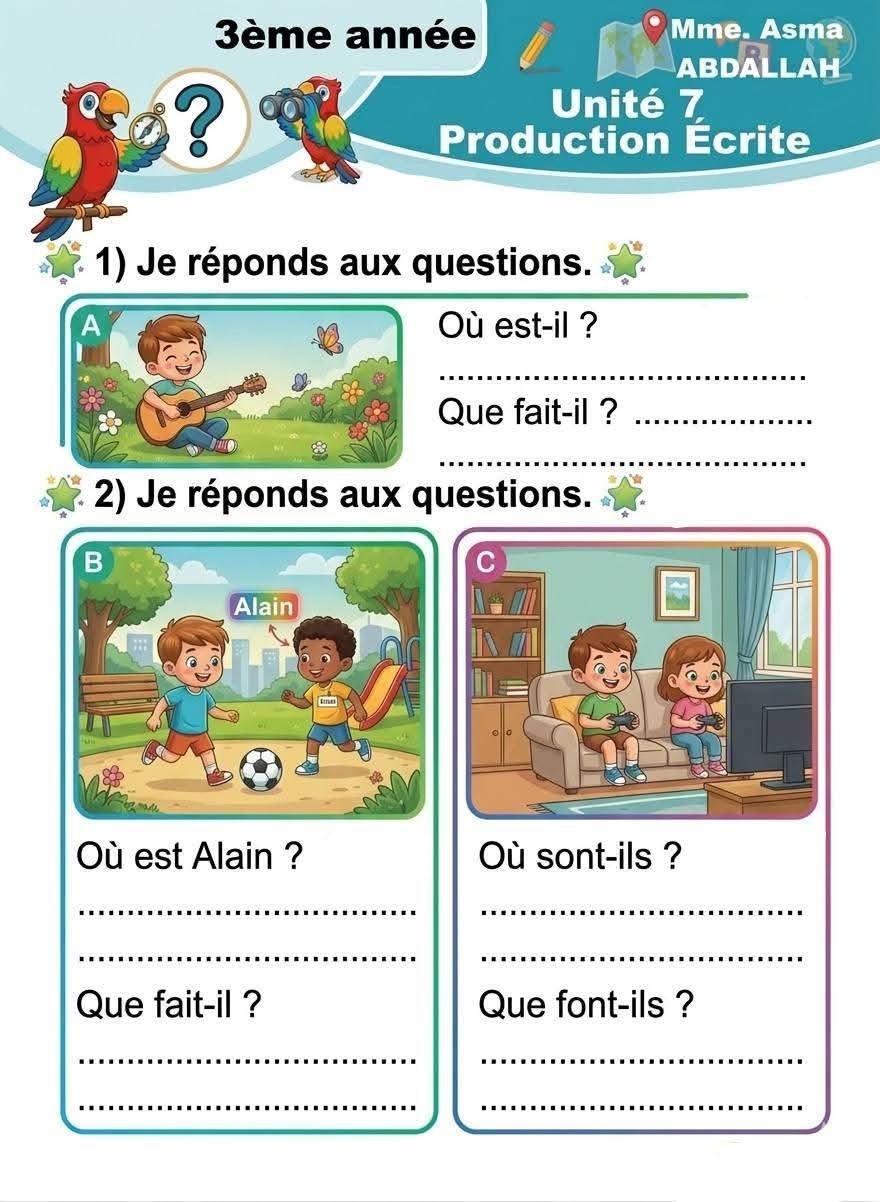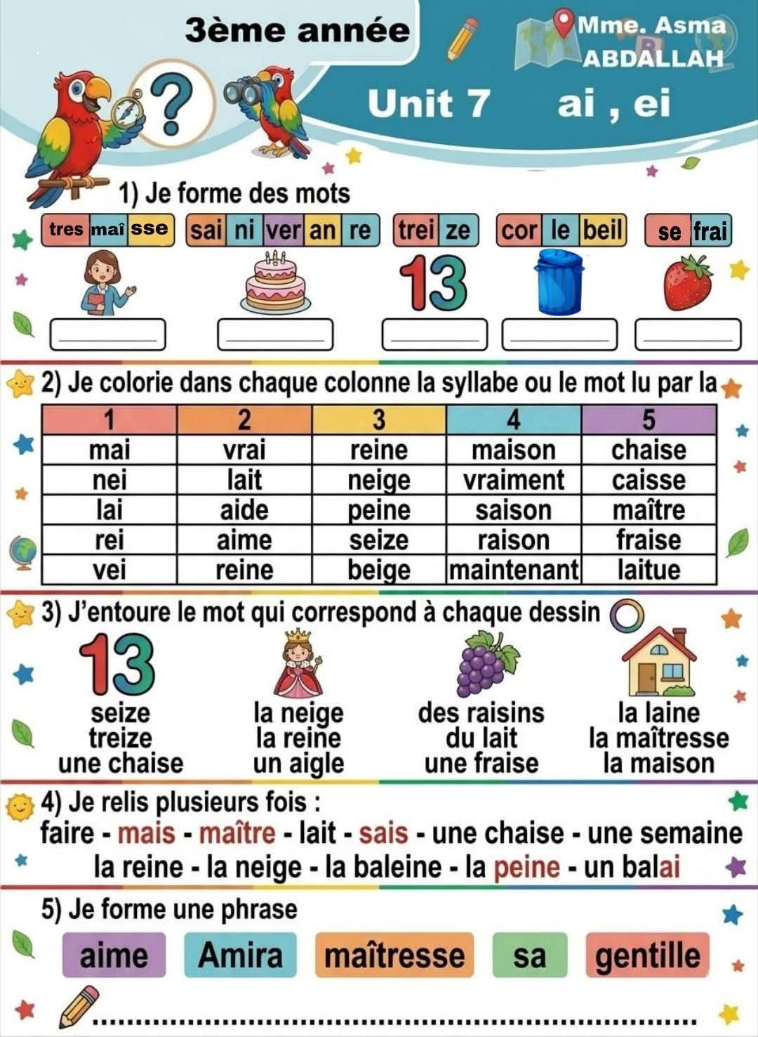 مراجعة شاملة للوحدة السابعة (Unité 7) لغة فرنسية للسنة الثالثة ابتدائي: أصوات [in] و[ain] و[ein] مع تمارين تطبيقية