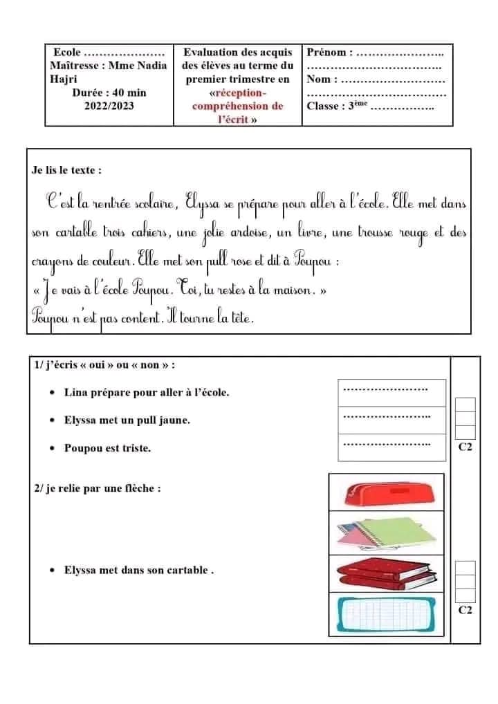 امتحانات فرنسية السنة الثالثة 3️⃣ الثلاثي الأول
